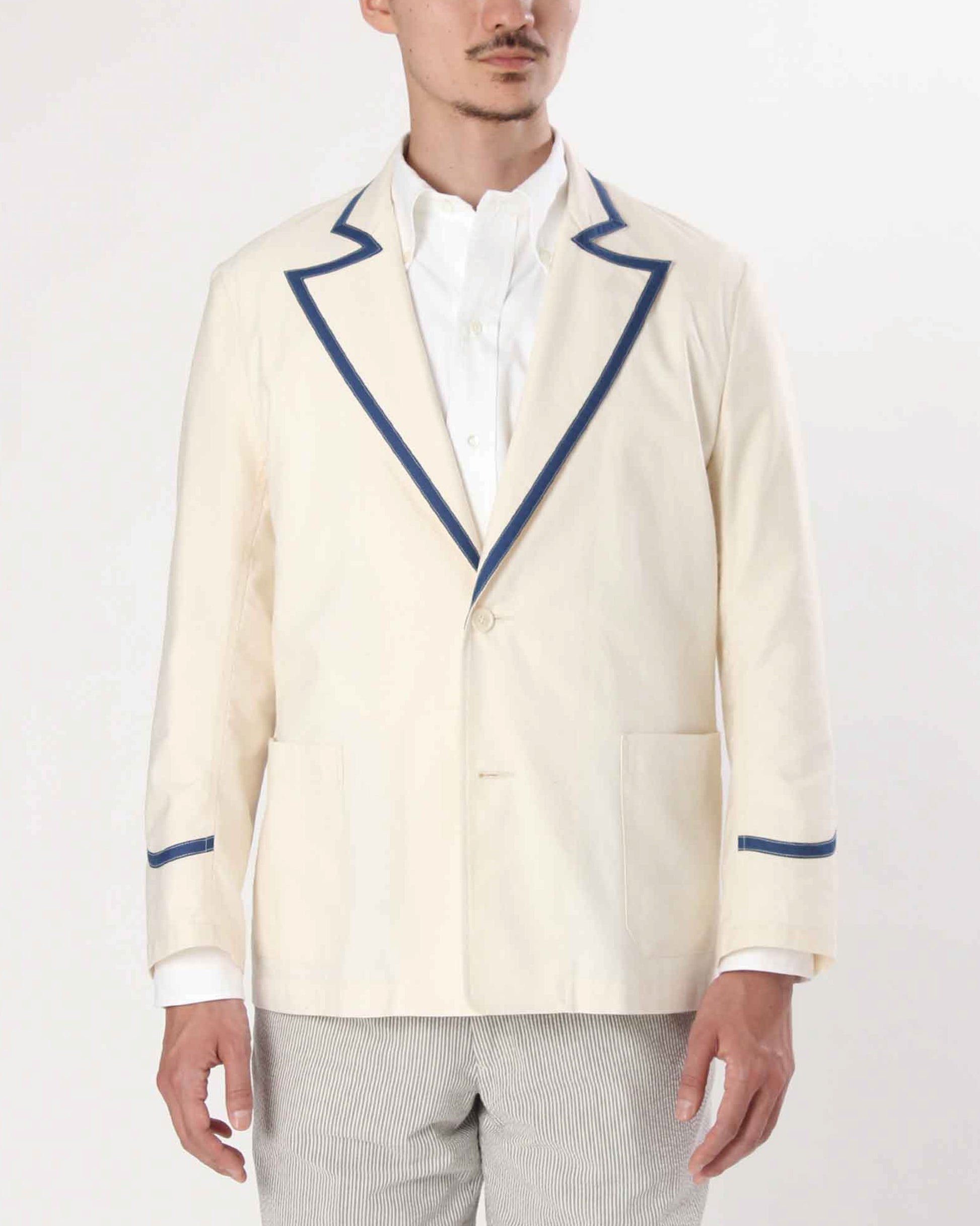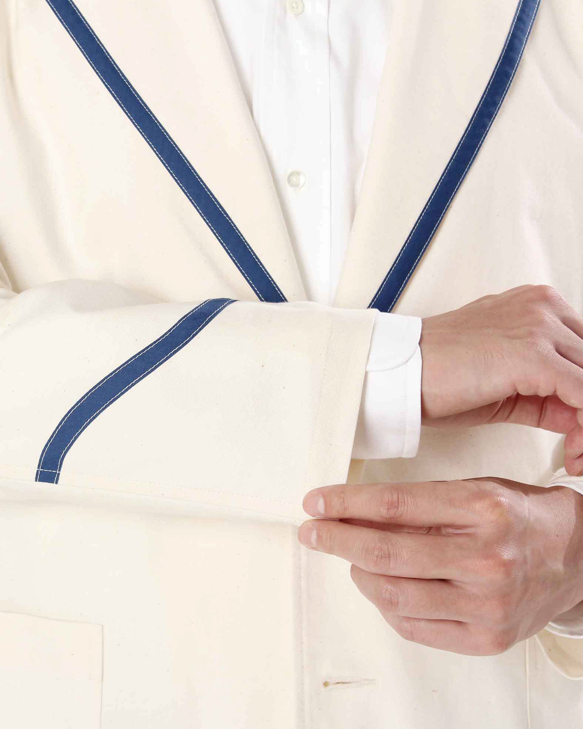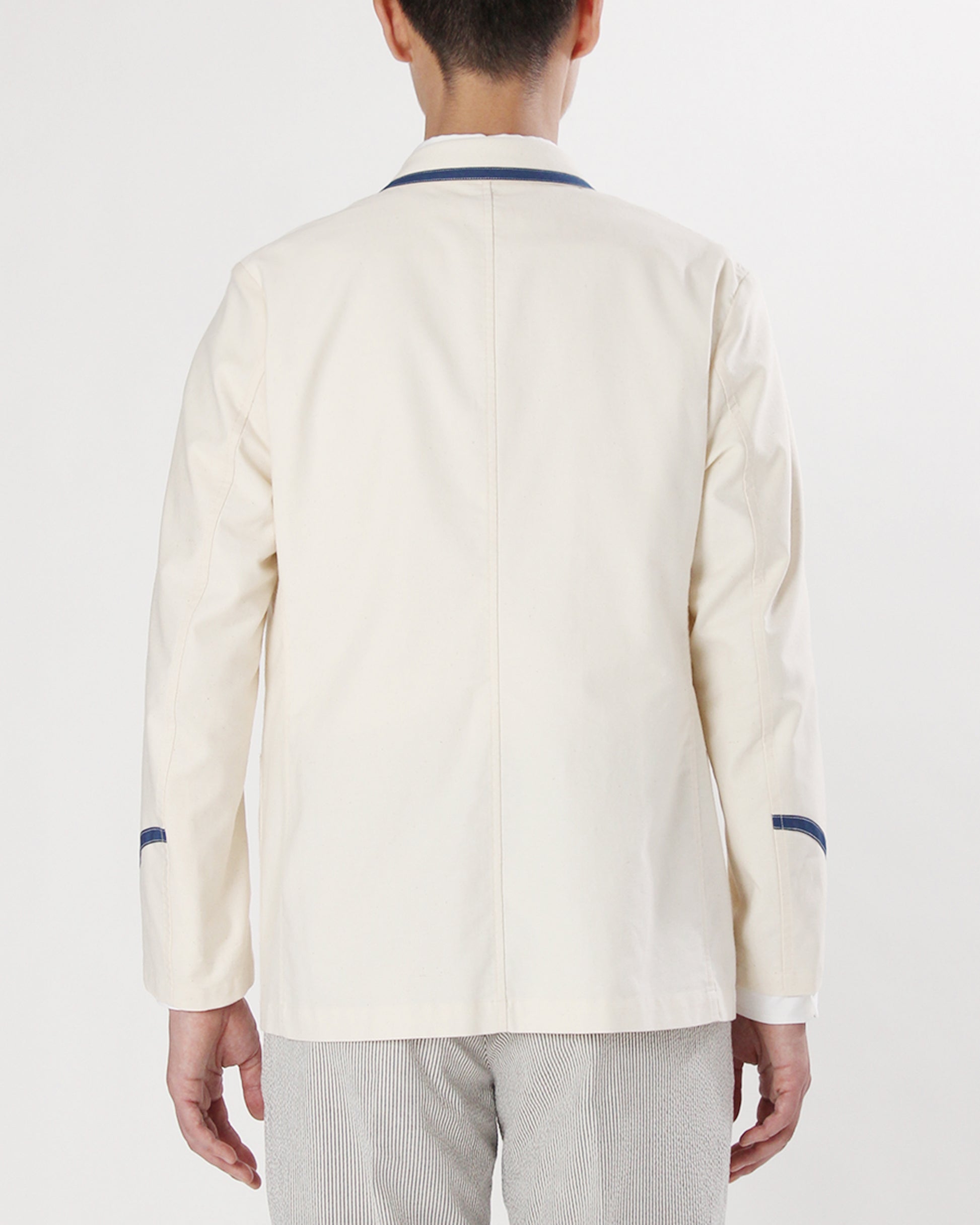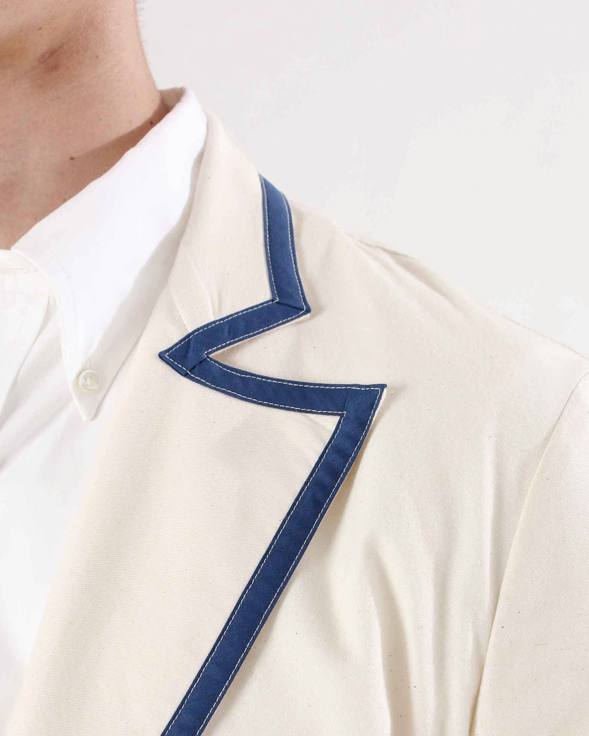 The contrasting blue accents on the lapels and cuffs make for a striking detail.