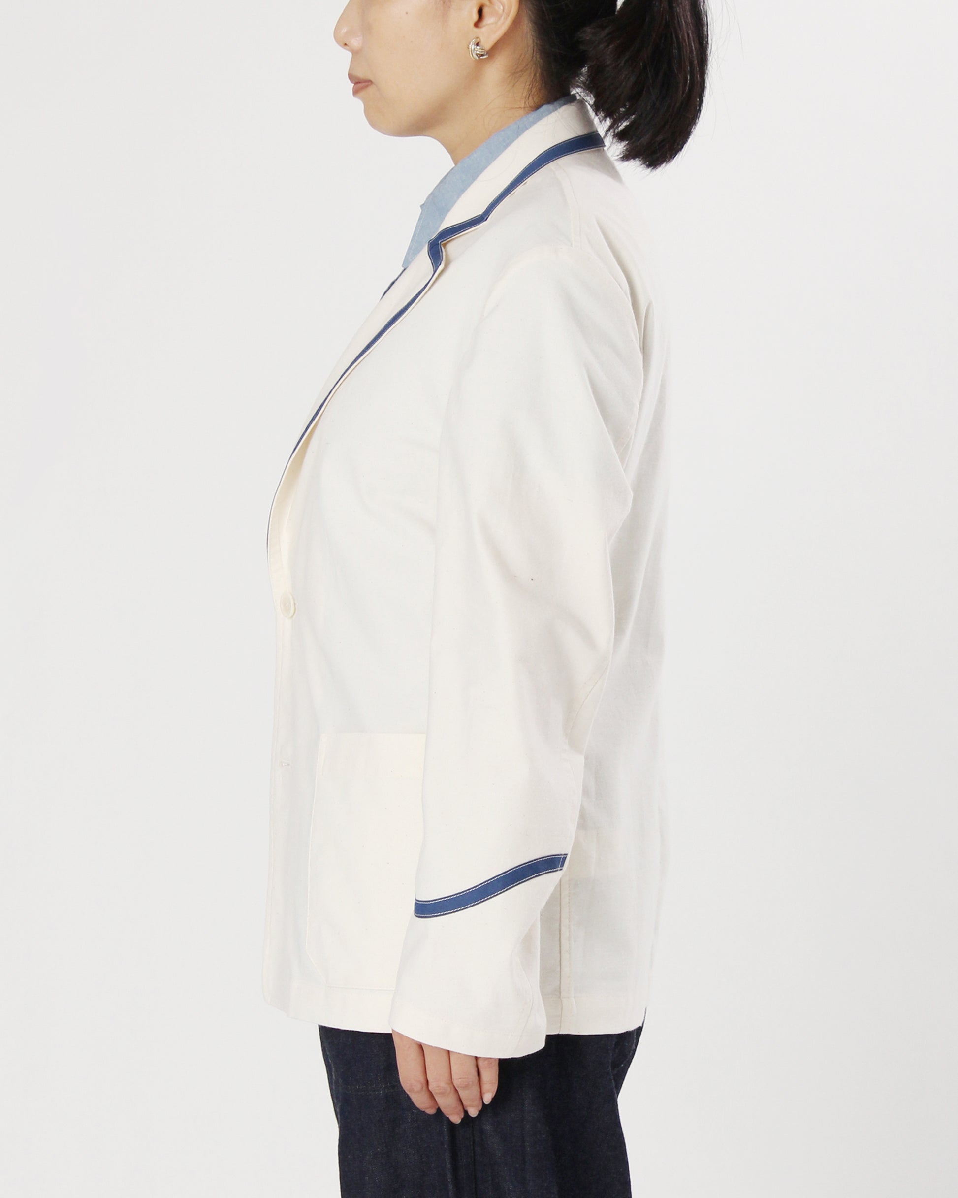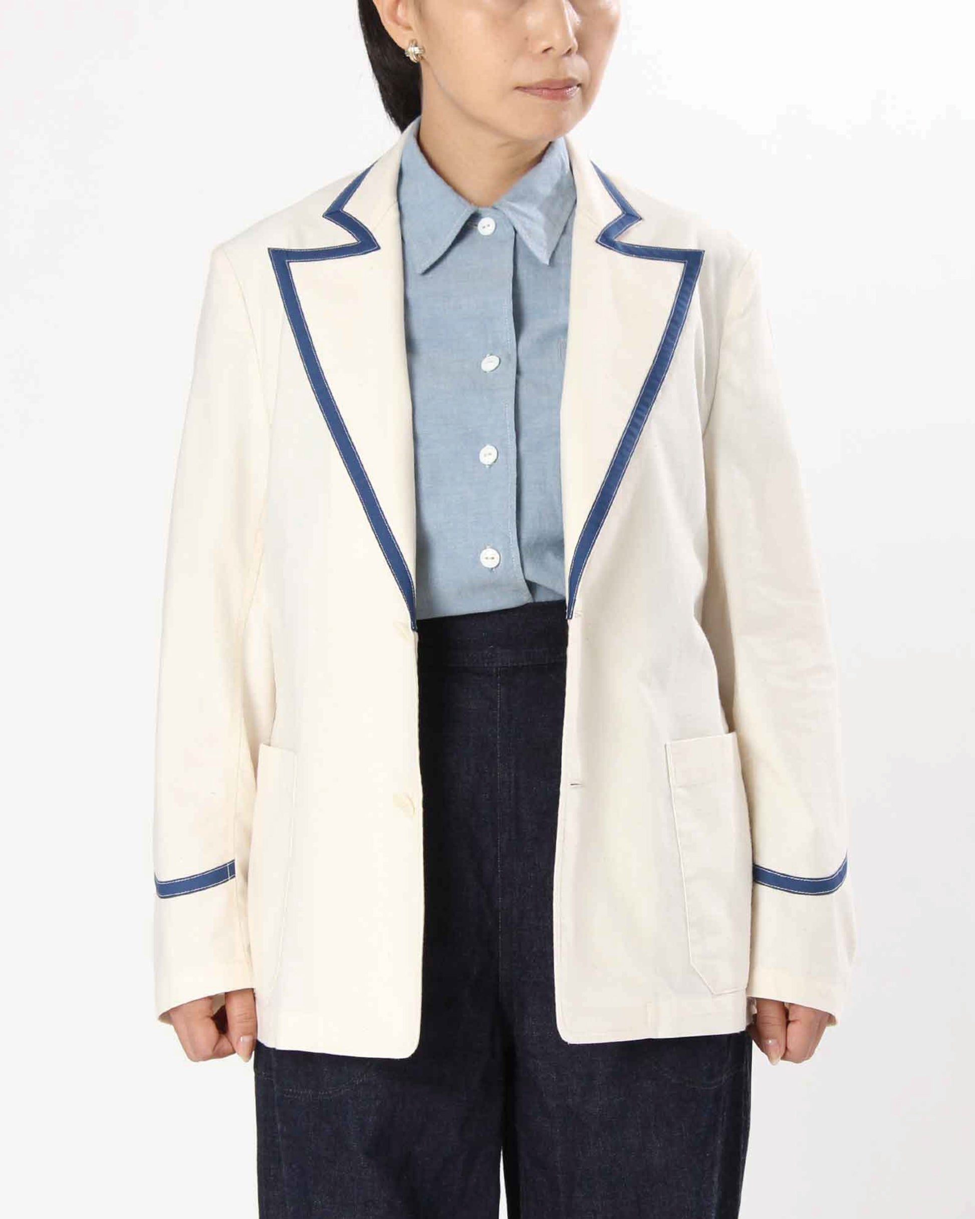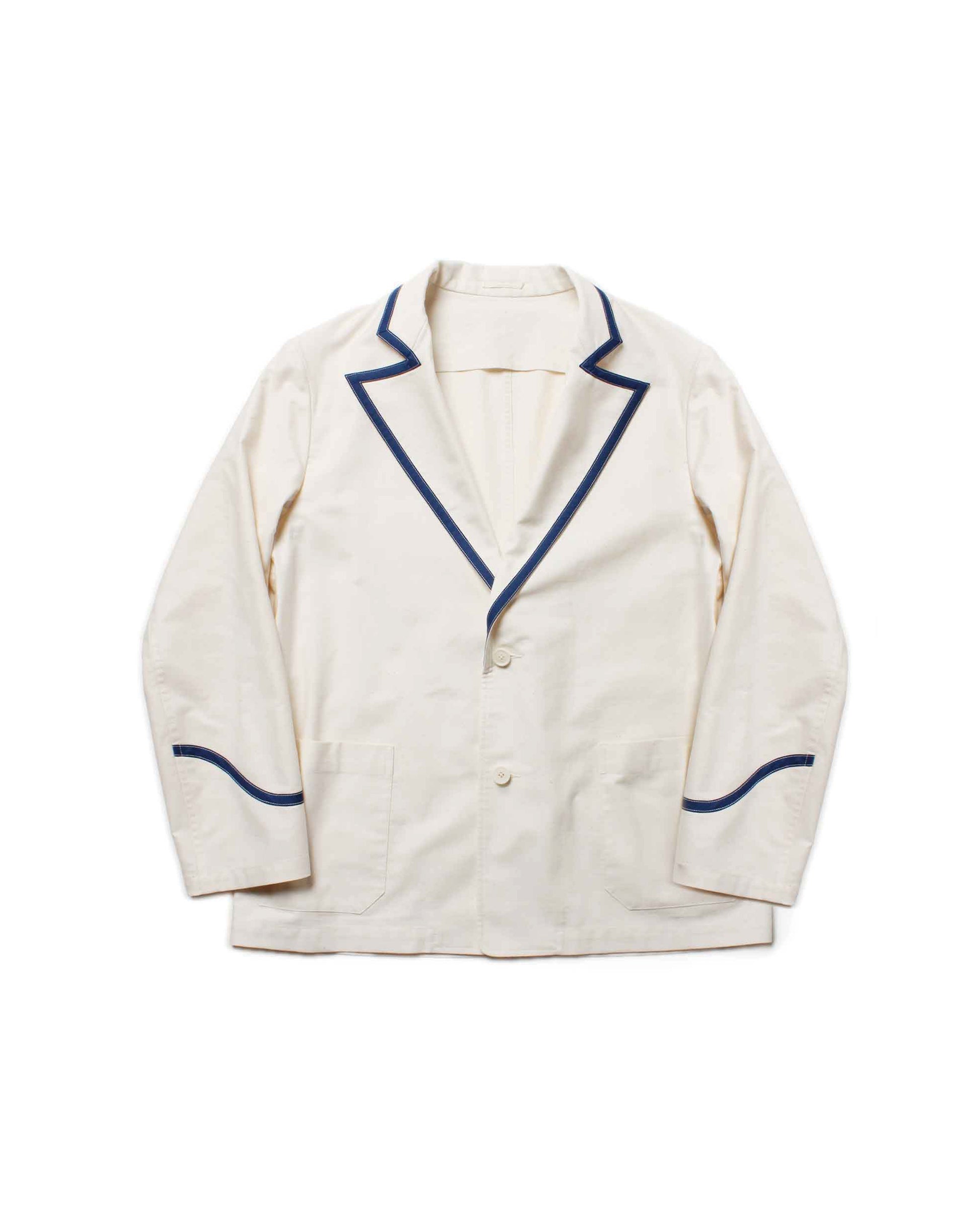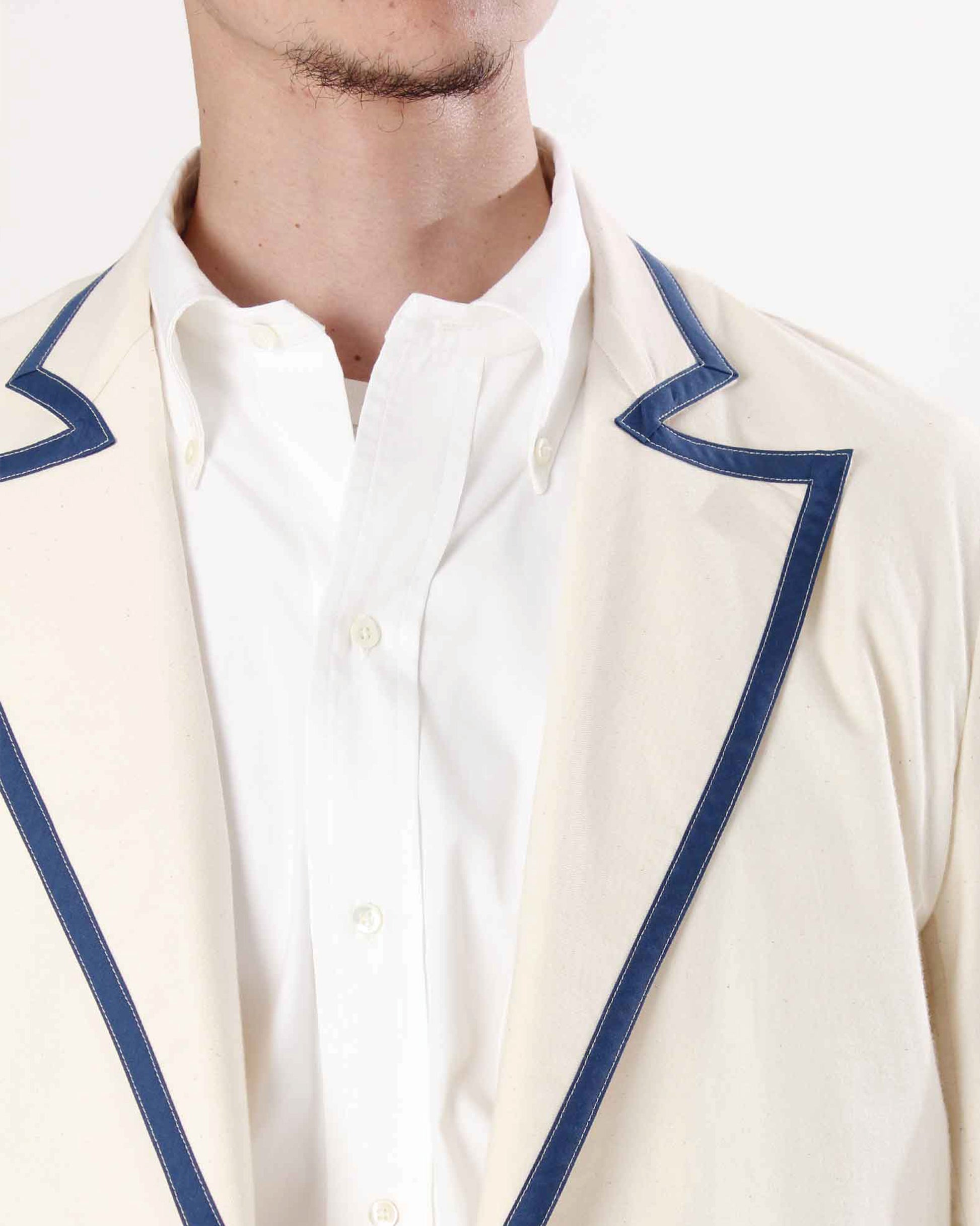 The contrasting blue accents on the lapels and cuffs make for a striking detail.
