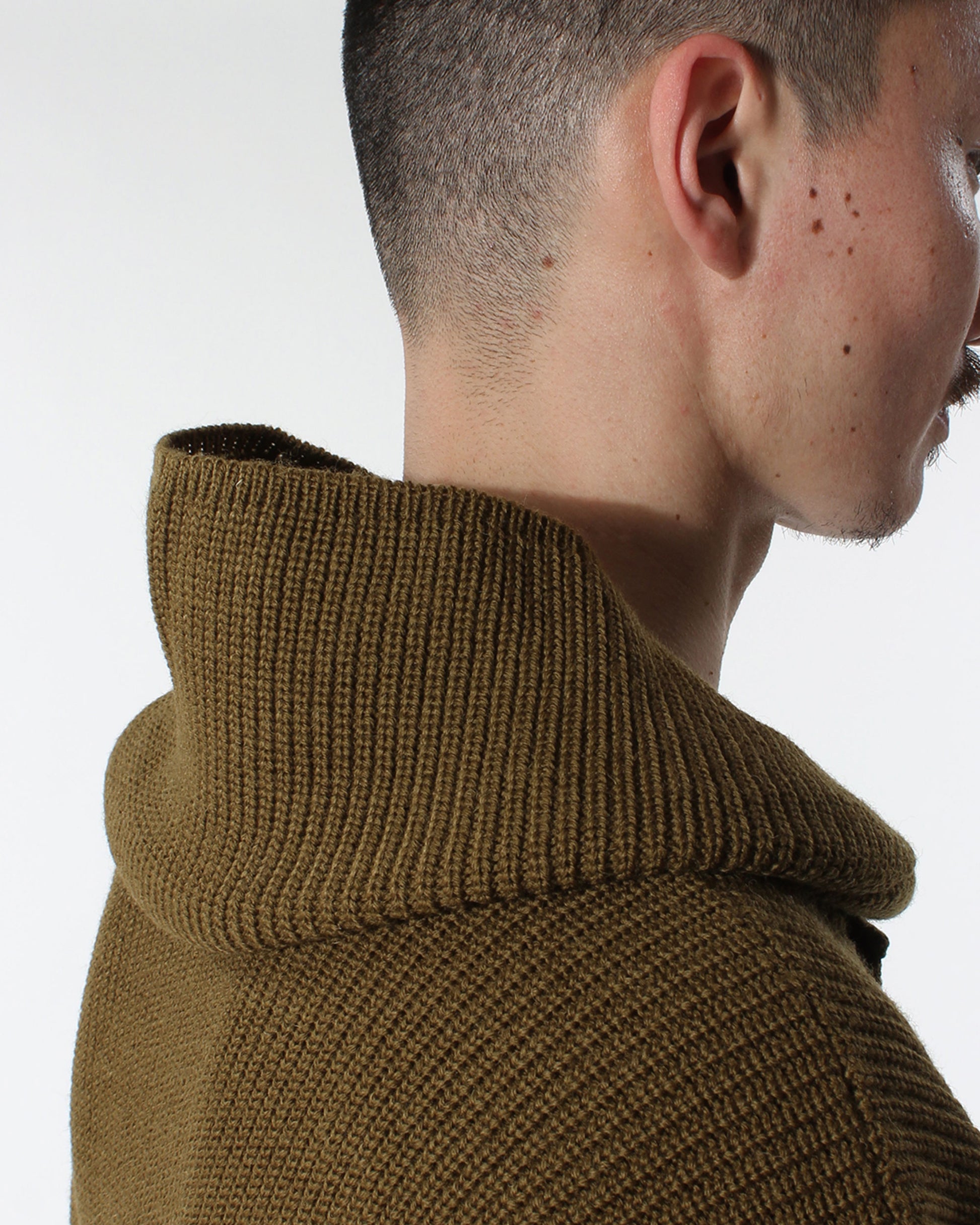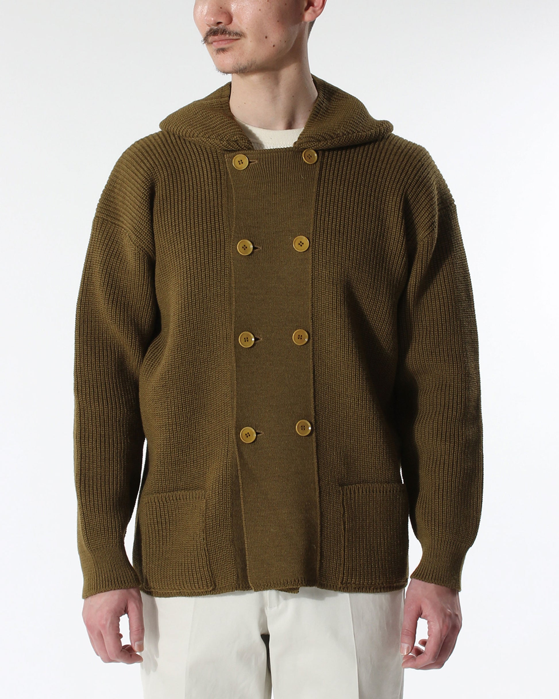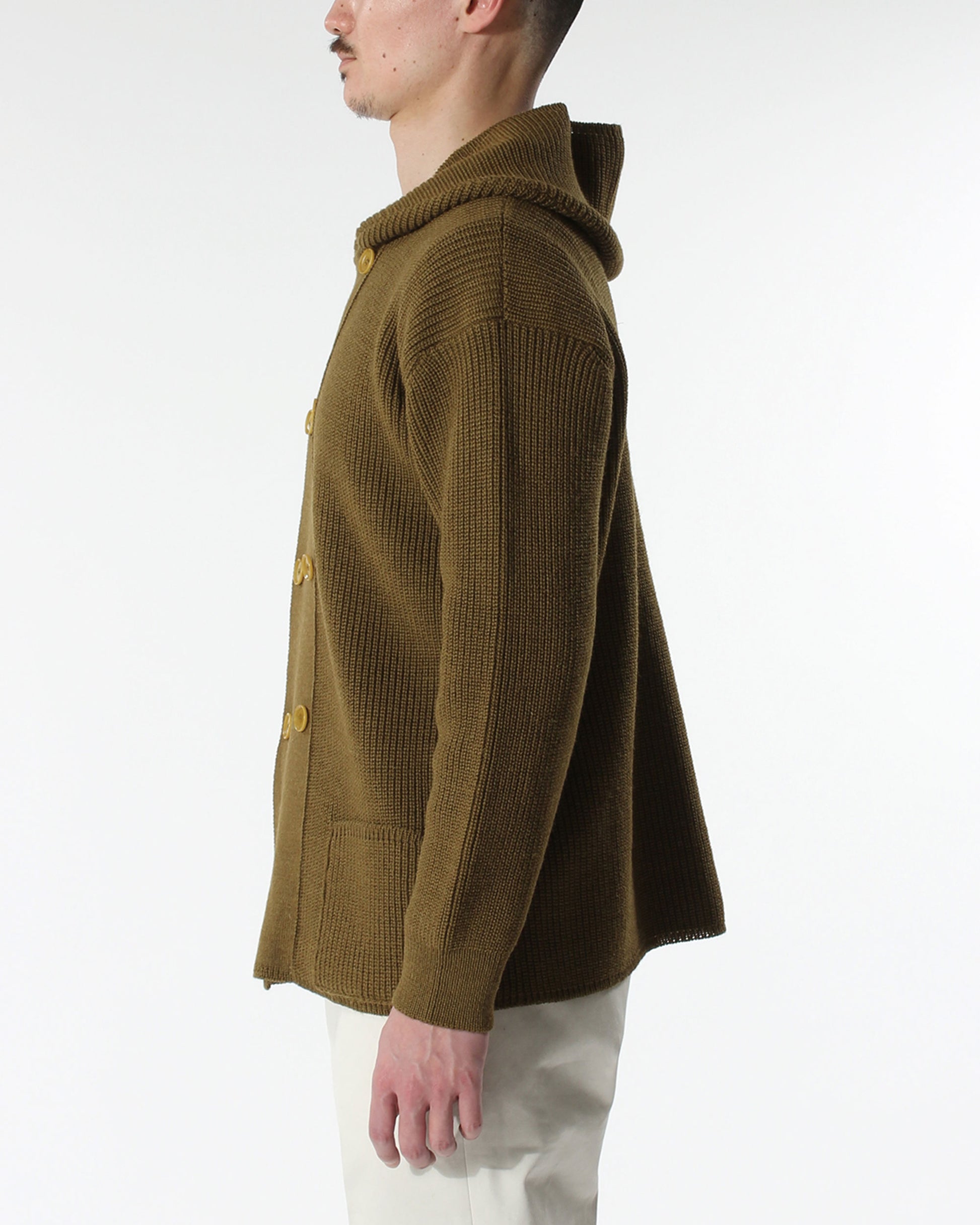1940年代NAVY GOBで使用されていた未化炭の原毛を使用したジャケットです。フードを折り込んでショールカラーとしても、ボタンを外してラペル風にも着用可能です。