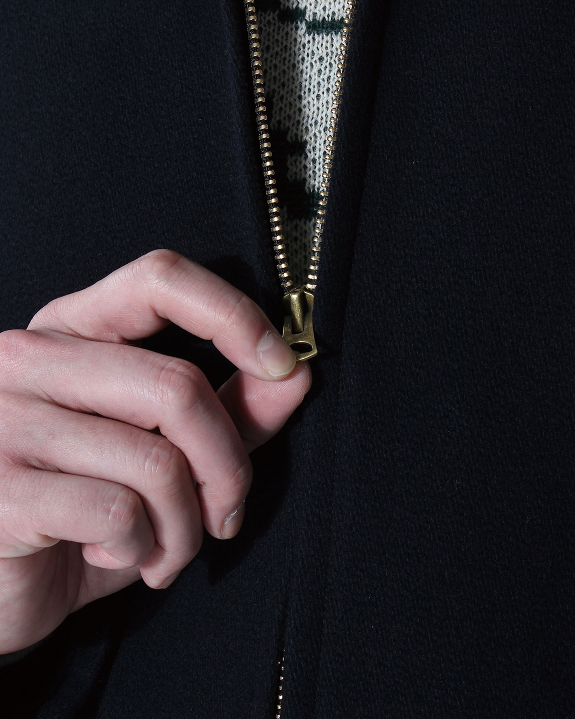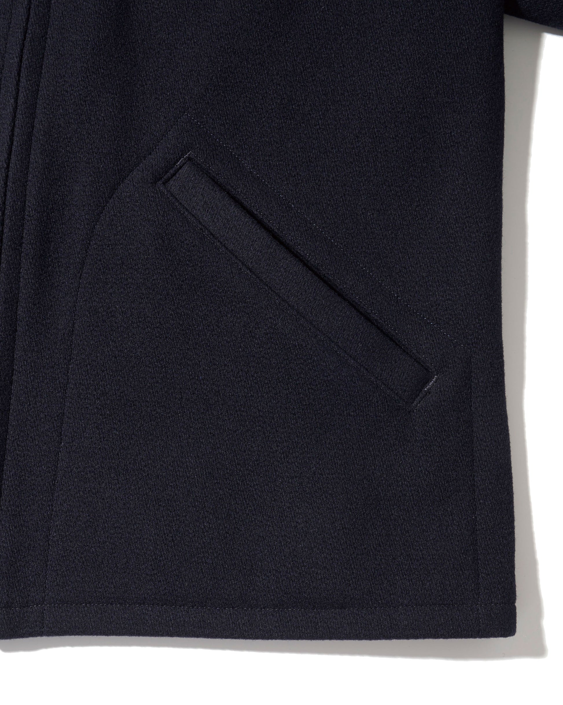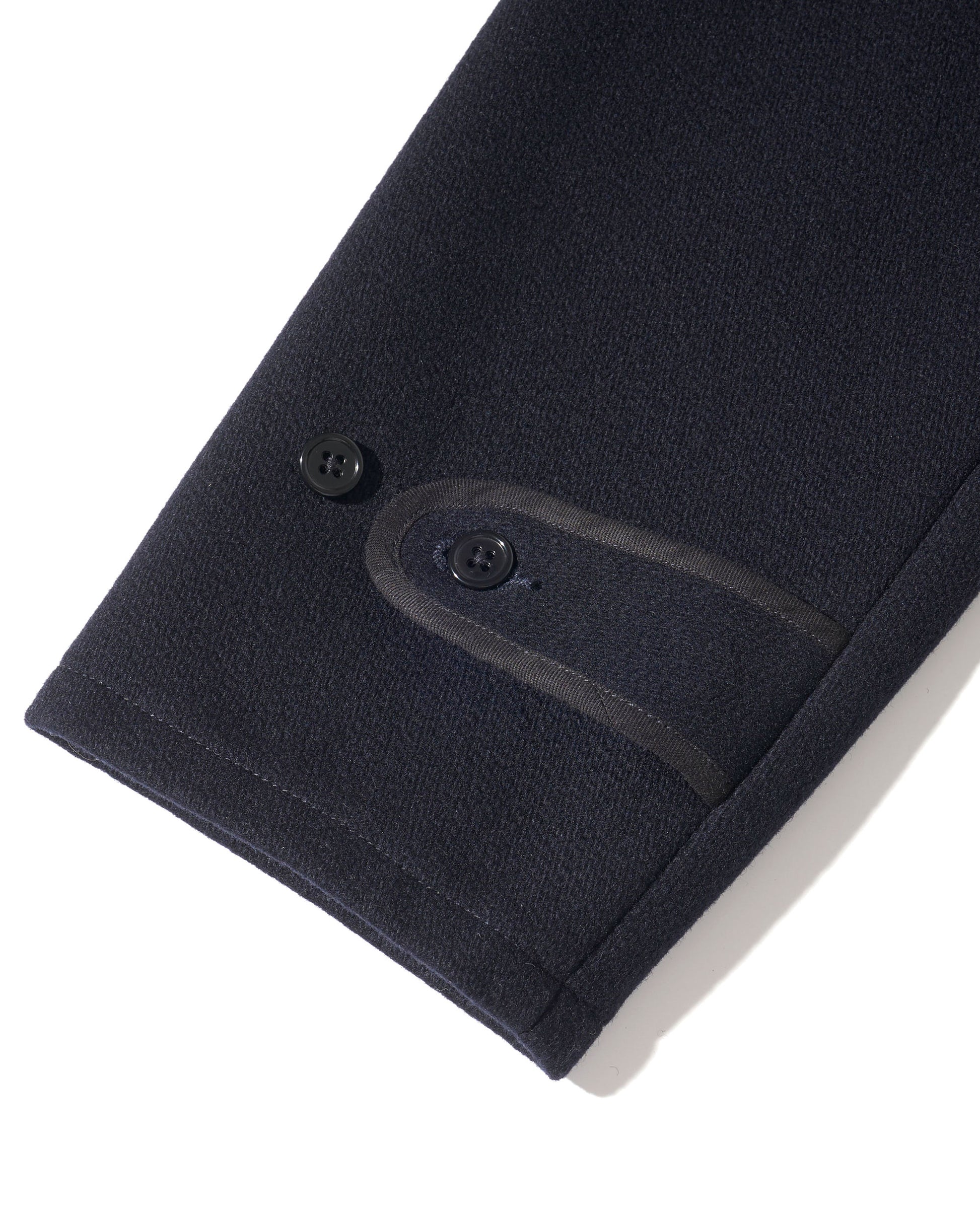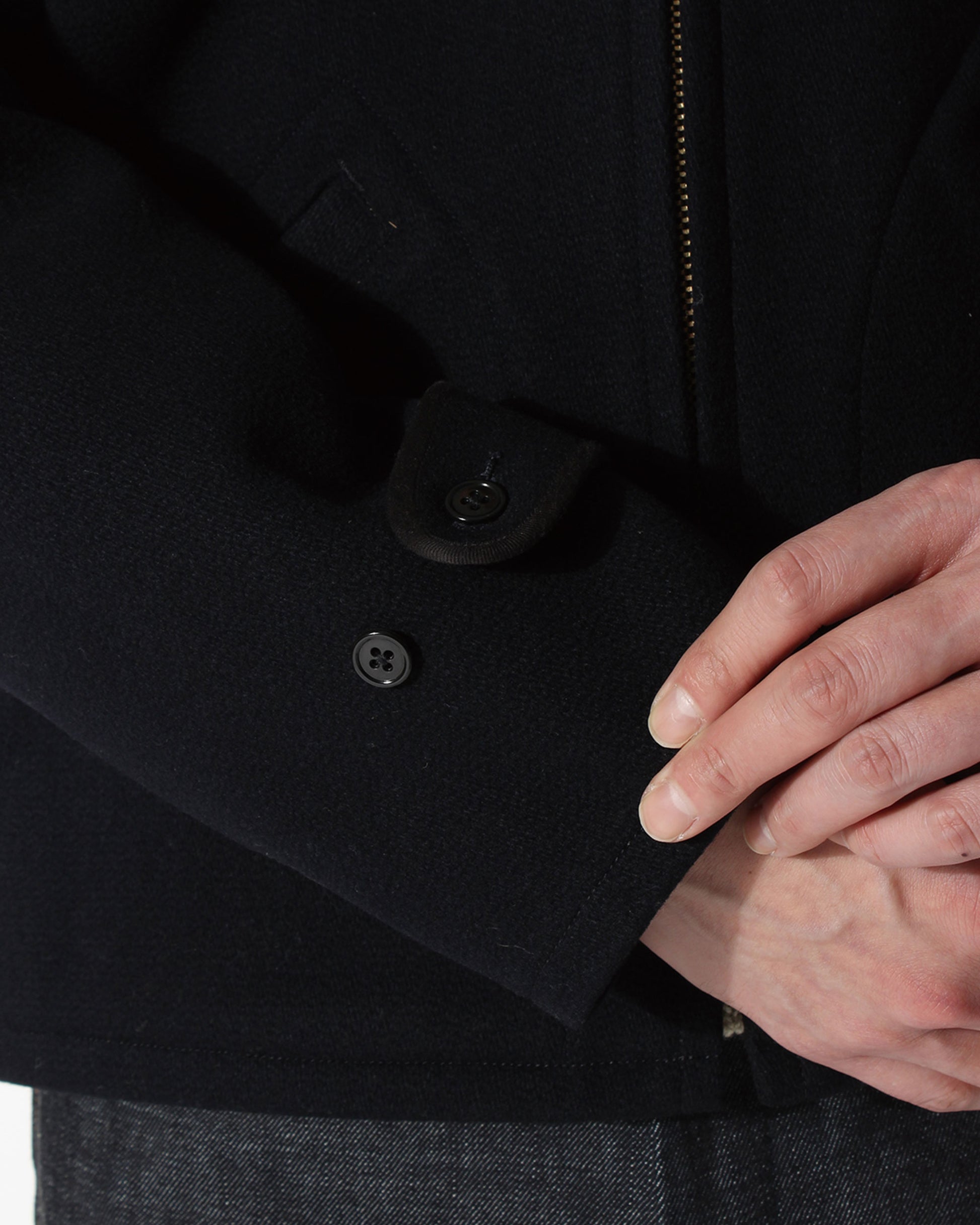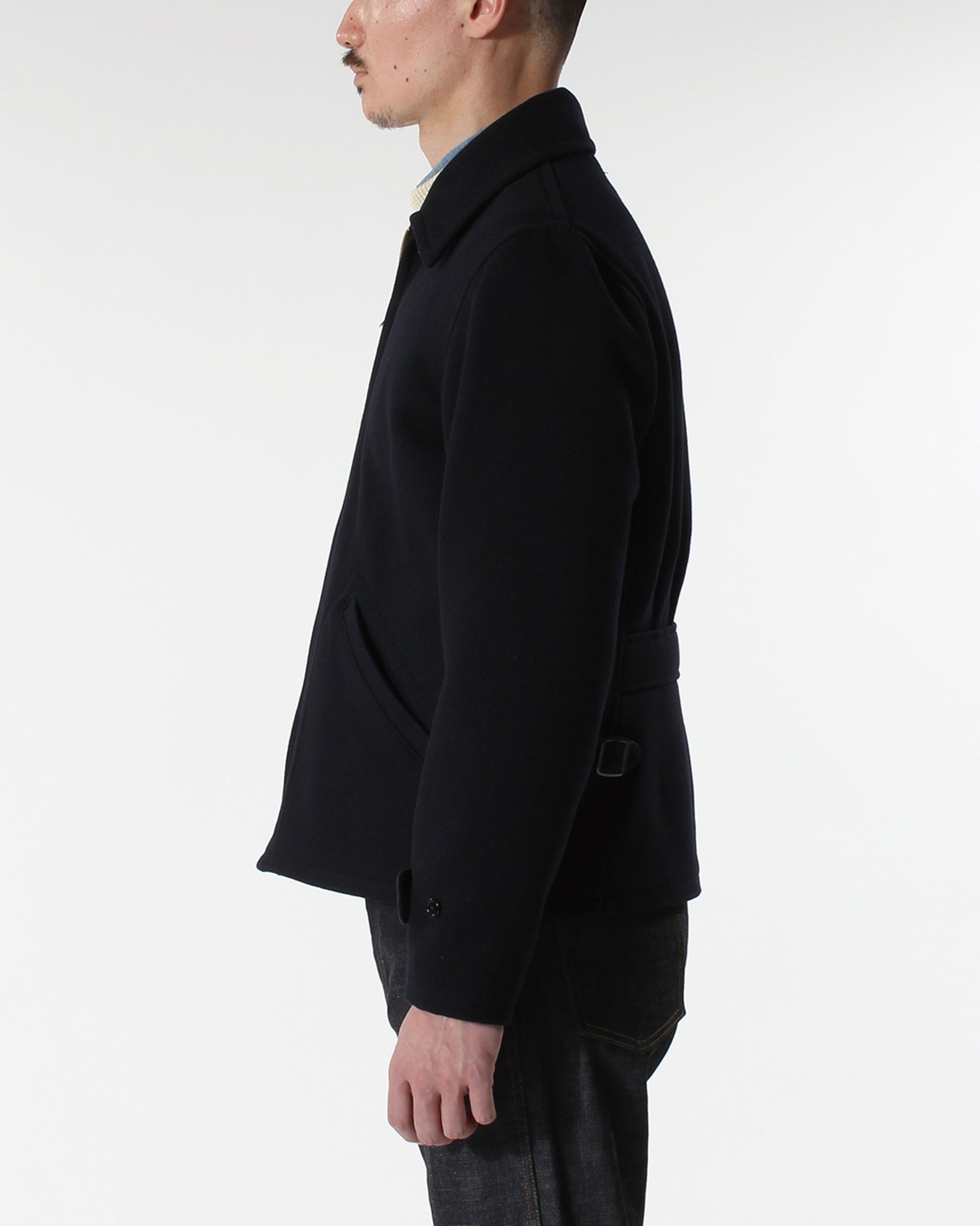 オールドメルトン素材でクラシカルなシルエットを保ちつつ、着込むほどに体に馴染み、独特の風合いが生まれます。両脇のアジャスターでウエストの調整が可能で、無骨さと上品さを兼ね備えたジャケットです。