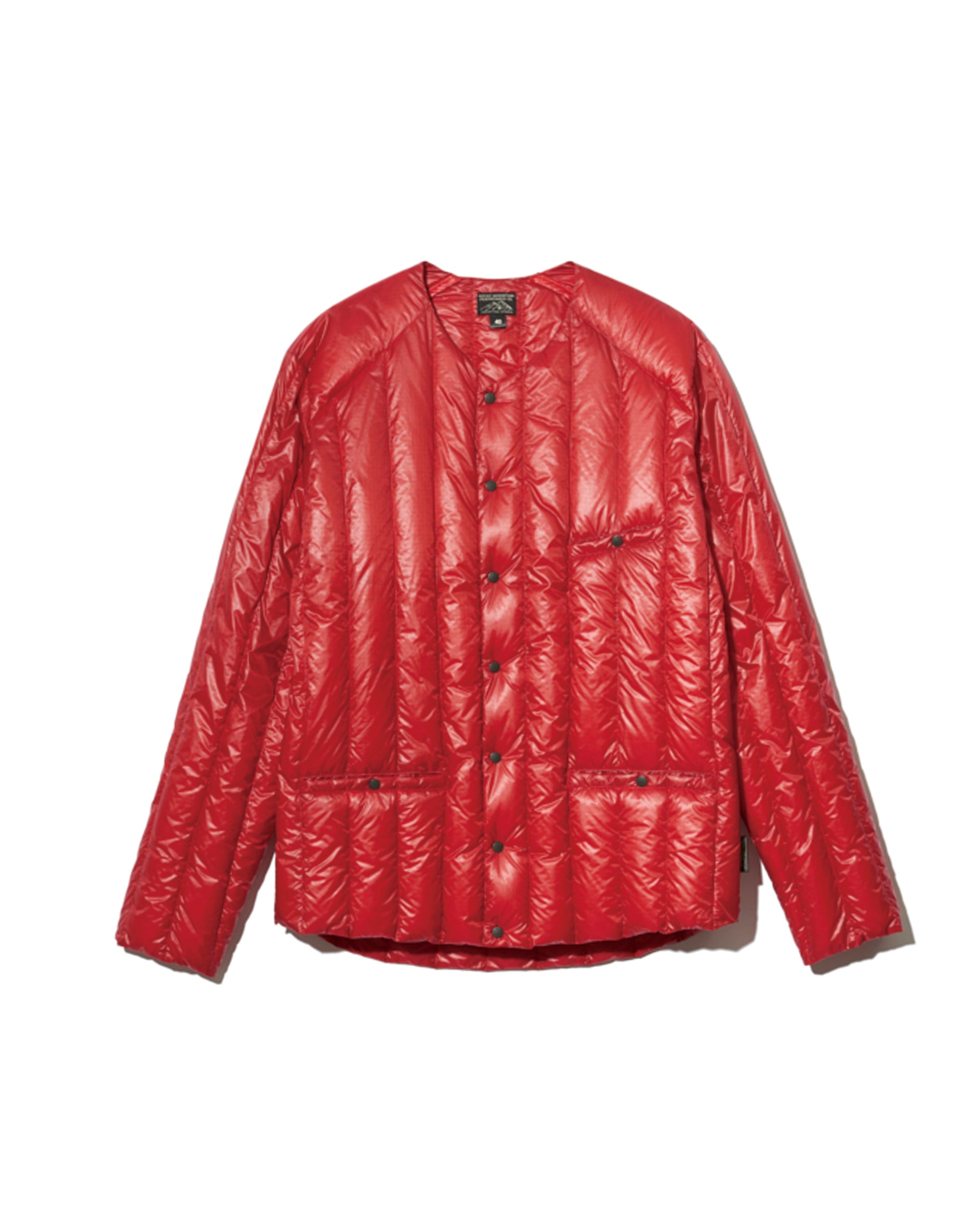 縦キルティングで偏りを防ぎ、美しいシルエット。耐久性あるナイロンタフタ使用。ノーカラーで重ね着しやすく、スナップボタンと3ポケットで機能的。